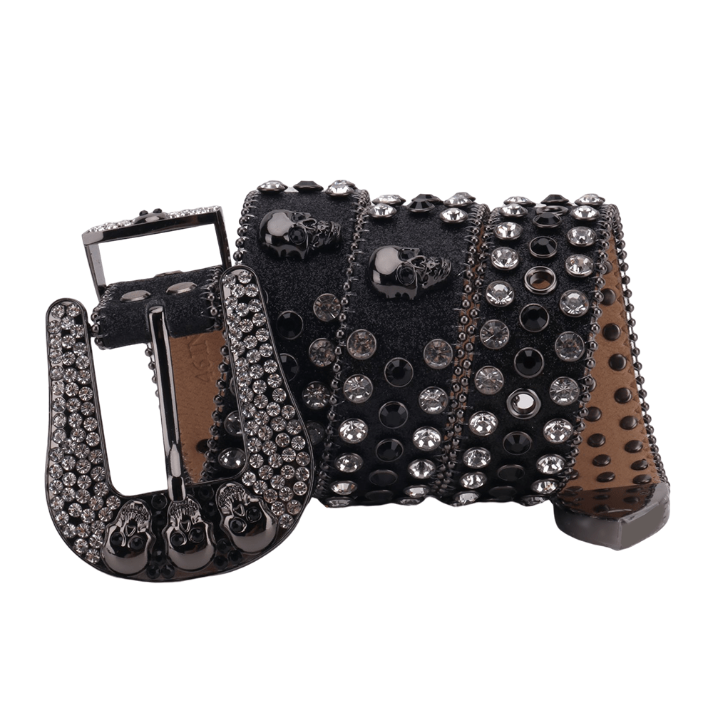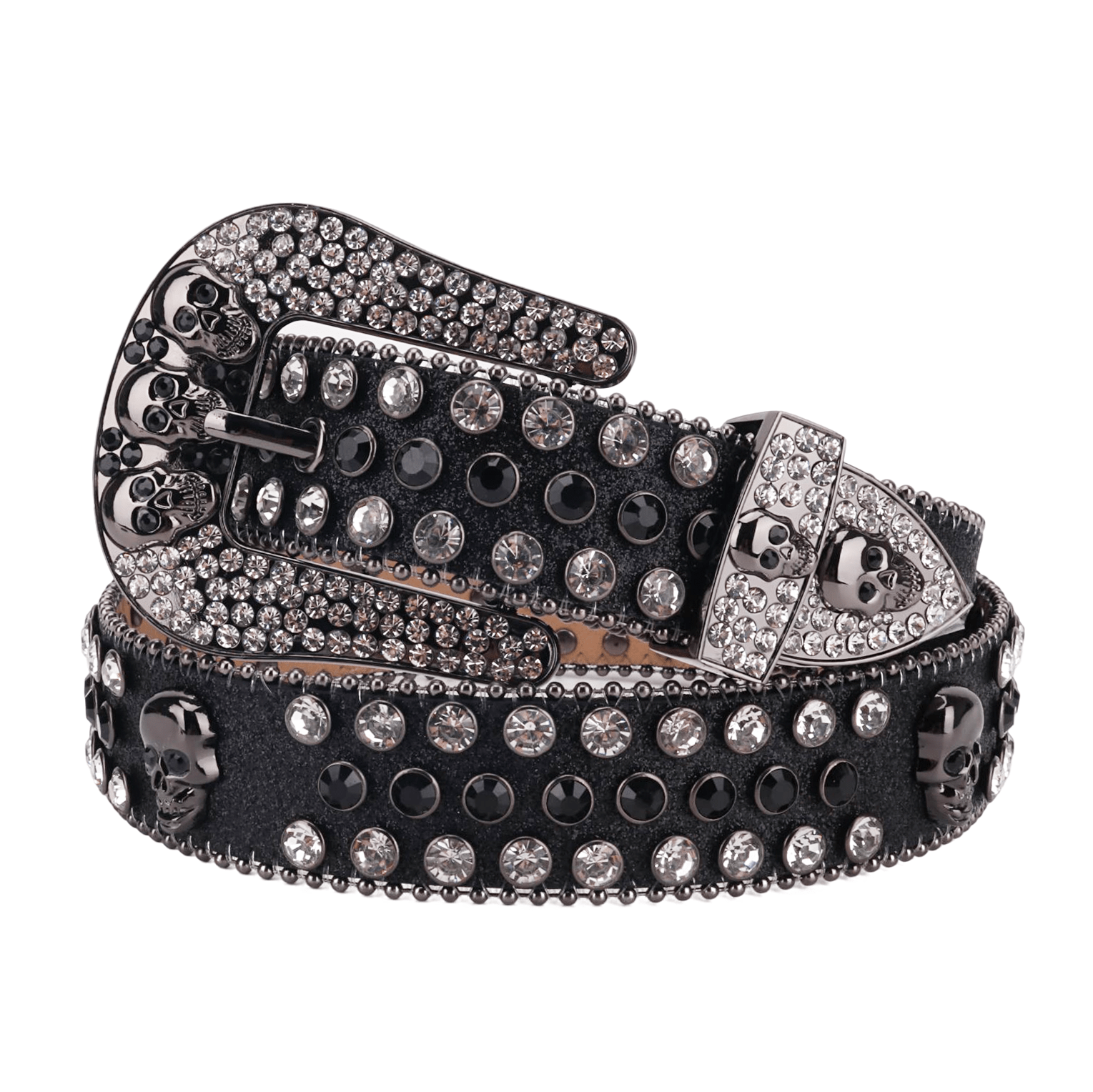 Black Leather Strap With Skulls Studded Black And Silver Rhinestone Belt