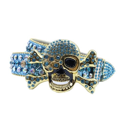 Unisex blue glitter leather belt, accented with blue and iridescent rhinestones along the strap and a dramatic buckle featuring a gold-tone skull and crossbones encrusted with rhinestones