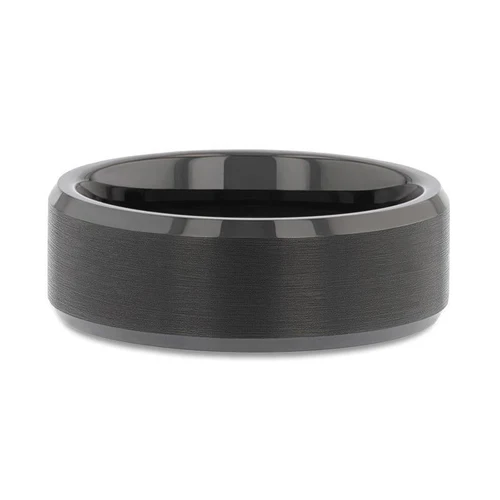 Made from high grade Black Tungsten Carbide this durable, simple yet elegant Thorsten design features a flat-profiled band with a finely brushed finish and polished beveled edges with a subtle touch of shine.