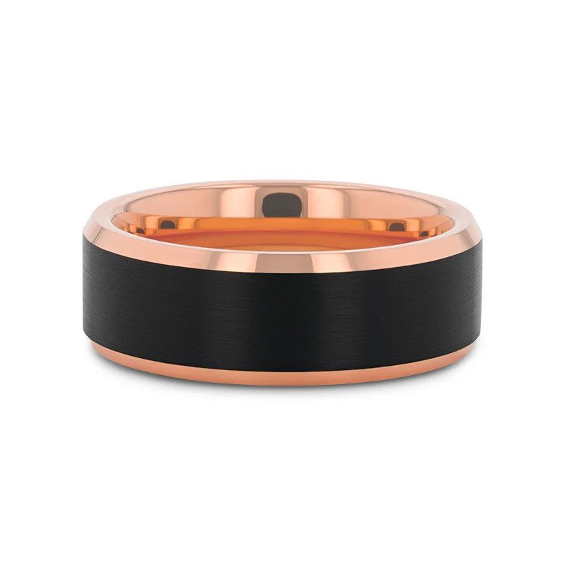 Bring bold and unique style to your union with this rose gold tungsten ring. Thanks to its pinkish color, rose gold is known to represent love, making it the perfect choice for a wedding band. Gold tungsten is more durable than traditional 14k gold, and the hue of this rose gold adds a vintage touch. The brushed black center creates extra dimension, and the polished bevel brings shine to the band. Made with comfort in mind, this tungsten rose gold men’s ring has a domed shank to make sliding the ring over the knuckle easier.