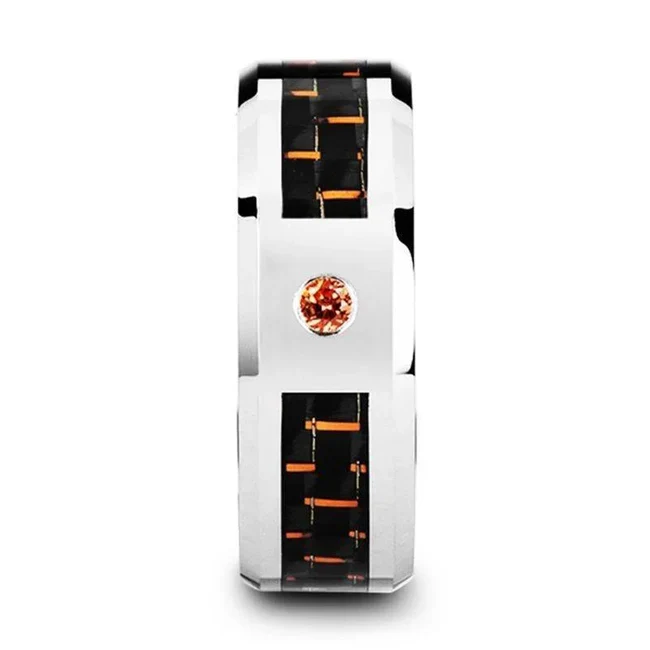 NOAH Tungsten Ring with Black and Orange Carbon Fiber and Orange Padparadscha Setting – 8mm