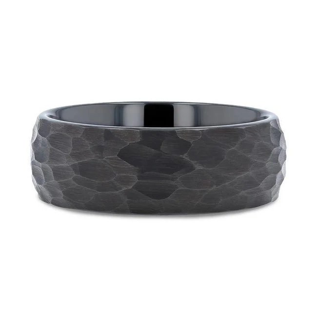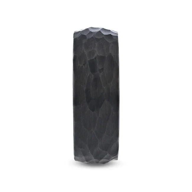 RENEGADE Domed Hammer Finish Black Tungsten Carbide Wedding Band with Brushed Finish – 6mm or 8mm This heavy-duty and hammered finish of this Thorsten-designed dark and sexy Black Tungsten Carbide wedding band makes a bold statement about the strength of your love and can be worn as a wedding band or promise ring by men or women.