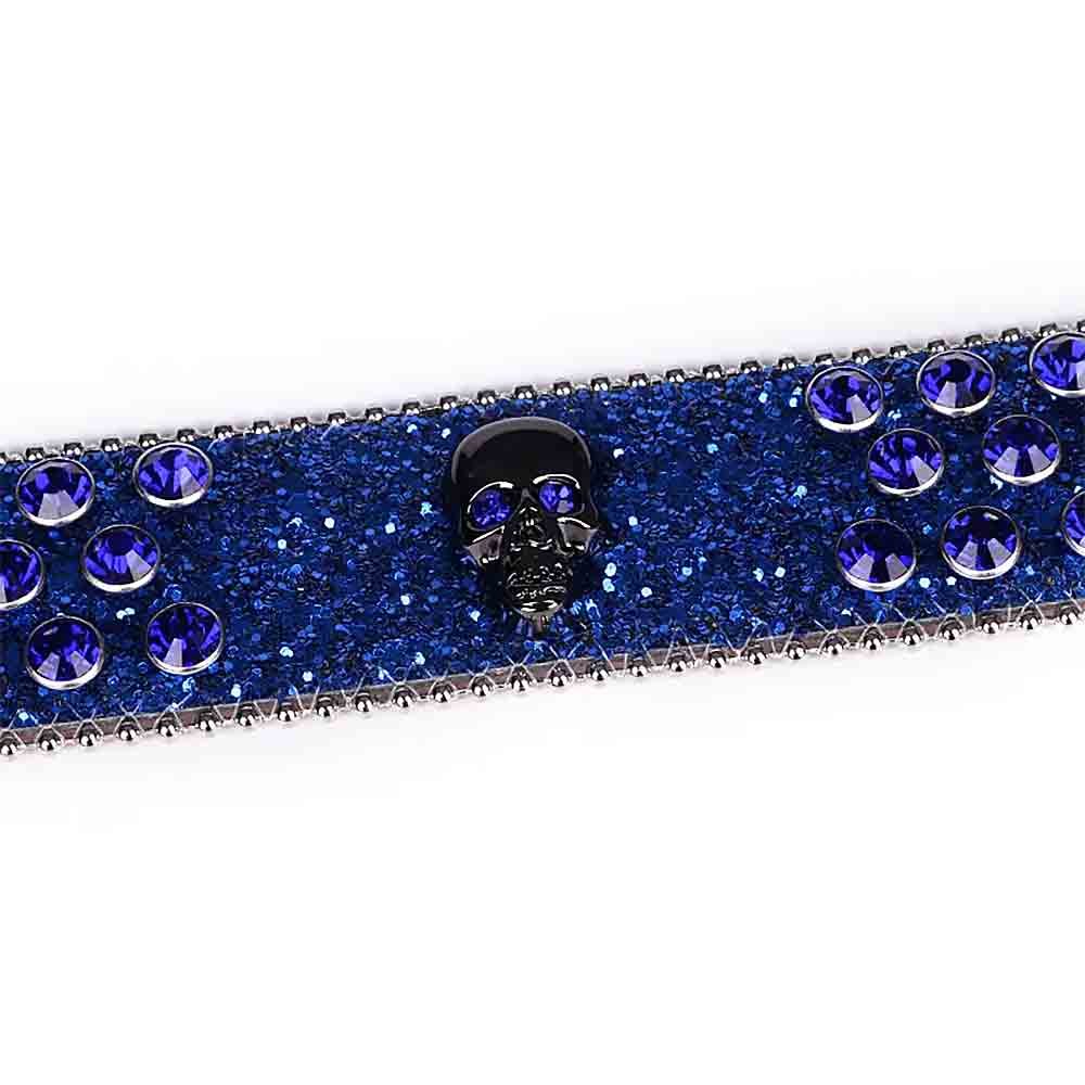 Unisex Royal Blue Leather Belt with Skulls Studded Blue Real Rhinestones & Classic Black Skull Buckle