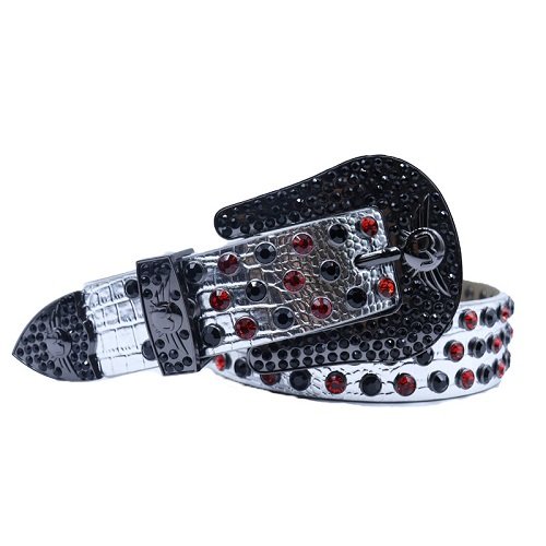 Silver Textured Leather Belt With Black And Red Rhinestone